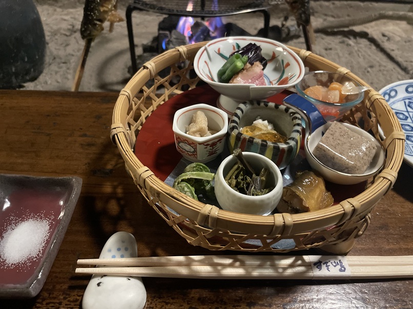 籠盛りにいろいろな小鉢が入った前菜からスタート。